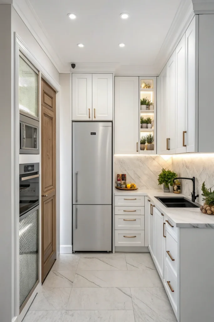 Pro Tip: Use integrated appliances strategically in tiny kitchen design—typically just the refrigerator—since full integration proves expensive and may not justify costs in compact spaces with limited appliances.