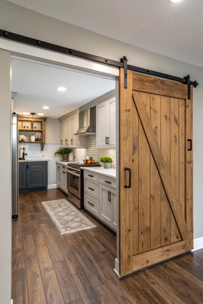 Pocket doors sliding into walls eliminate swing clearance traditional doors require in tiny kitchen design spaces opening to other rooms. The space savings can mean the difference between functional and cramped.