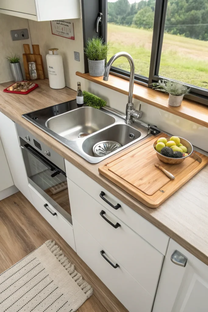 Install fold-down tables or pull-out cutting boards creating temporary surfaces in tiny kitchen design that disappear when not needed. Over-the-sink cutting boards and stove-top covers convert fixtures into usable prep areas.