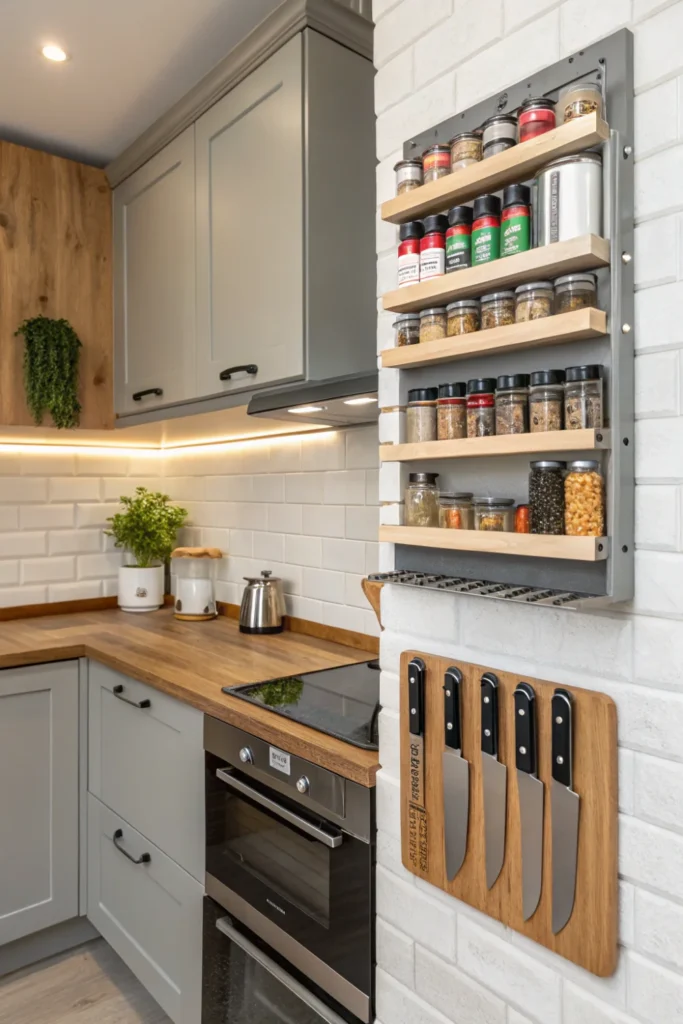 Magnetic knife strips, spice racks, and tool holders mounted on walls or sides of cabinets free drawer and counter space in tiny kitchen design. The vertical storage keeps essentials visible and accessible.