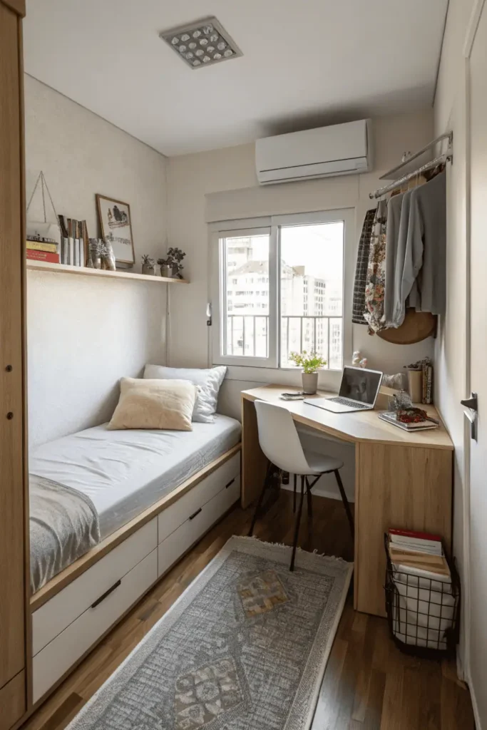 One useful arrangement is to place a narrow desk directly at the foot of the bed. This keeps all the big furniture in one line and leaves the opposite wall lighter. You can push a simple chair under the desk when it is not in use so that the walking path stays open.