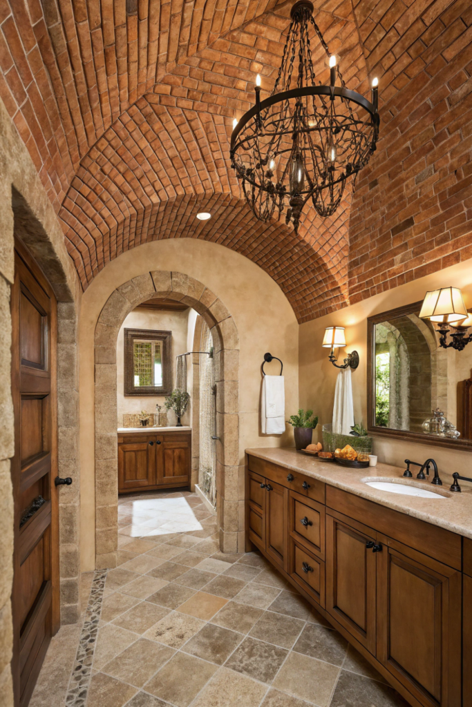Pinterest Image Prompt: Vertical 2:3 ratio image showing faux brick vaulted washroom ceiling design in warm terracotta tones, Mediterranean-style bathroom with arched doorway, wrought iron chandelier, stone floors, rustic wood accents
