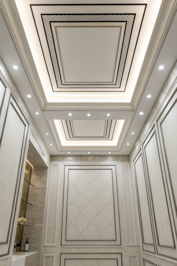This budget-friendly technique adds architectural dimension where none exists structurally. The color contrast draws eyes upward and makes standard flat ceilings feel more dynamic and intentionally designed.