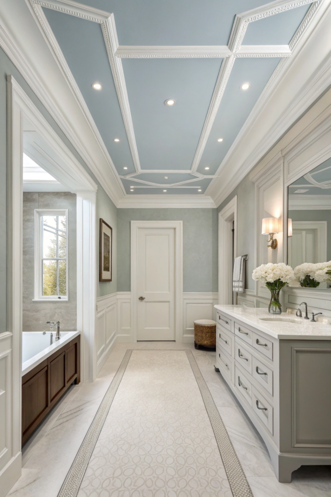Recessed grid washroom ceiling design creates architectural depth through systematic panel divisions separated by raised borders. This treatment adds subtle dimensionality without the expense of true coffered construction while maintaining clean contemporary lines.