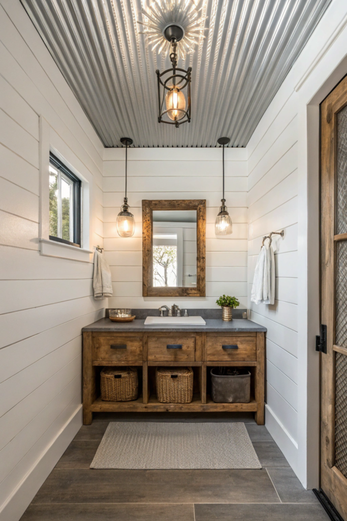 Corrugated metal washroom ceiling design brings farmhouse industrial character with ribbed galvanized or copper-toned steel panels. The wavy profile creates interesting shadow play as light moves throughout the day while adding textural contrast to smooth wall surfaces.